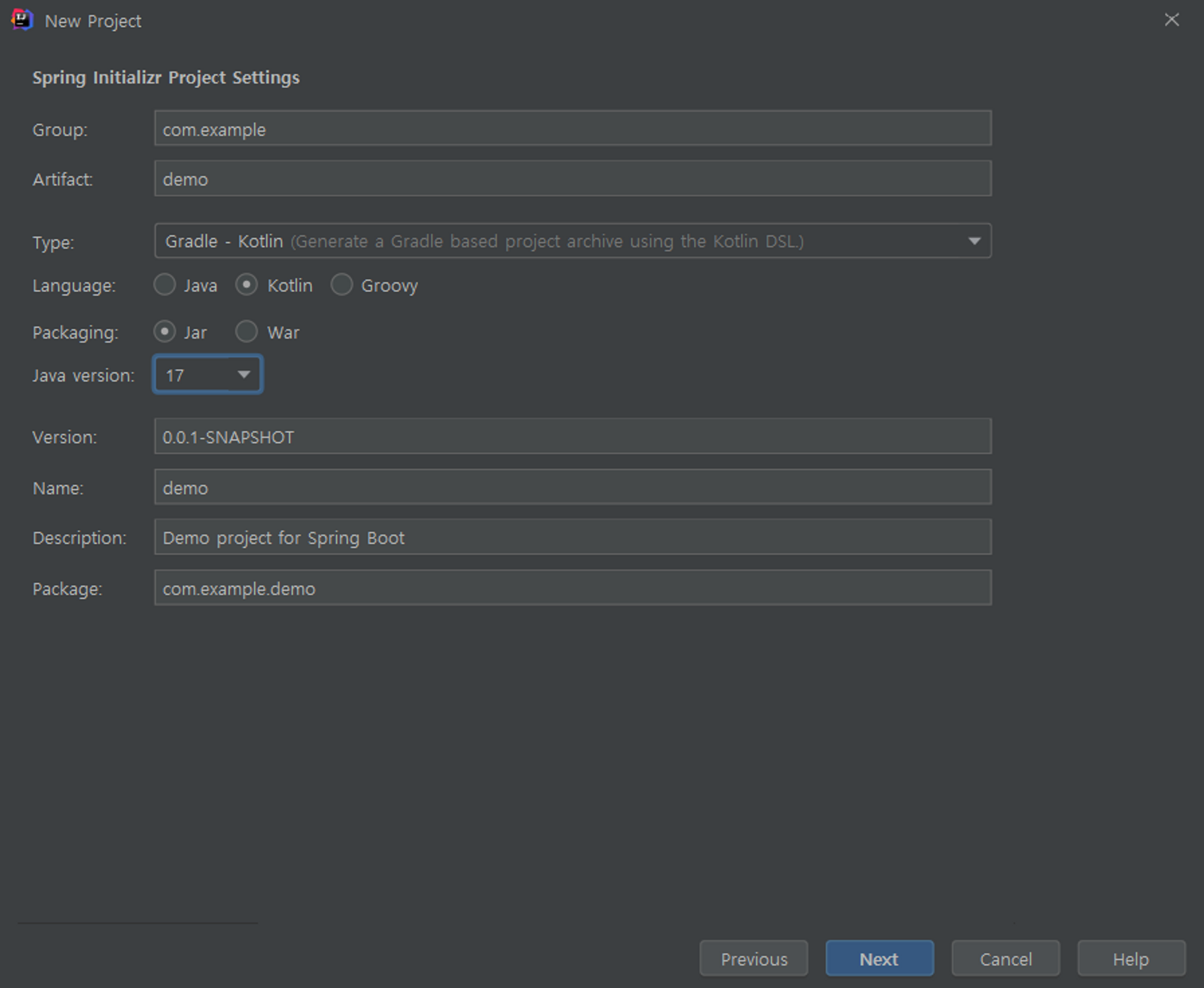 - language를 kotlin으로 선택, type은 gradle로 선택하여 next를 클릭한다.