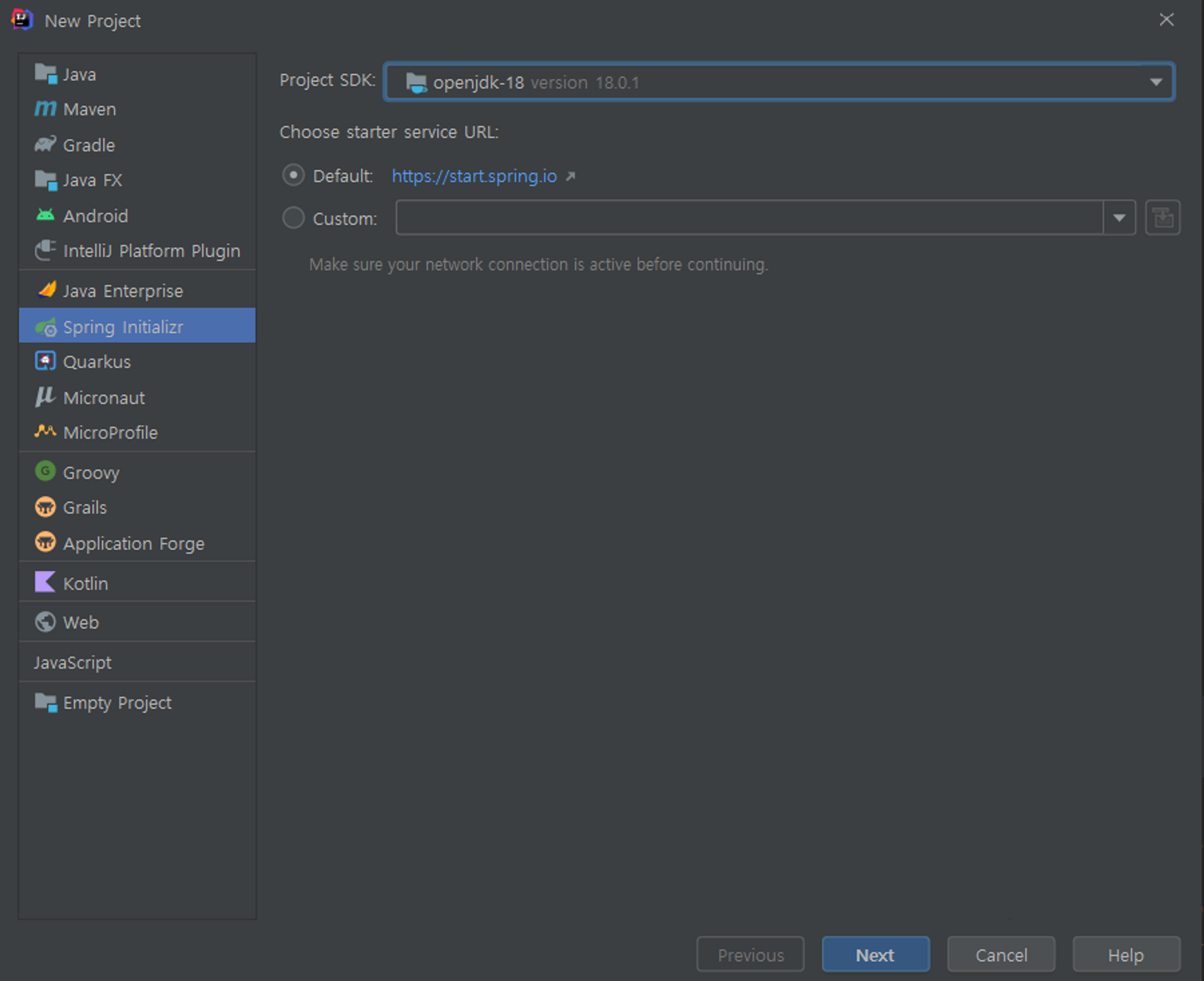 - Intellij 에서 file > new > project를 클릭해 New Project > Spring Initializr 탭을 선택