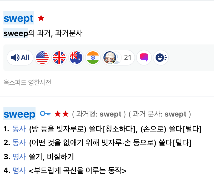 - She swept the crumbs into the wastebasket → 그녀는 빵 부스러기를 휴지통 속에 털어 넣었다.